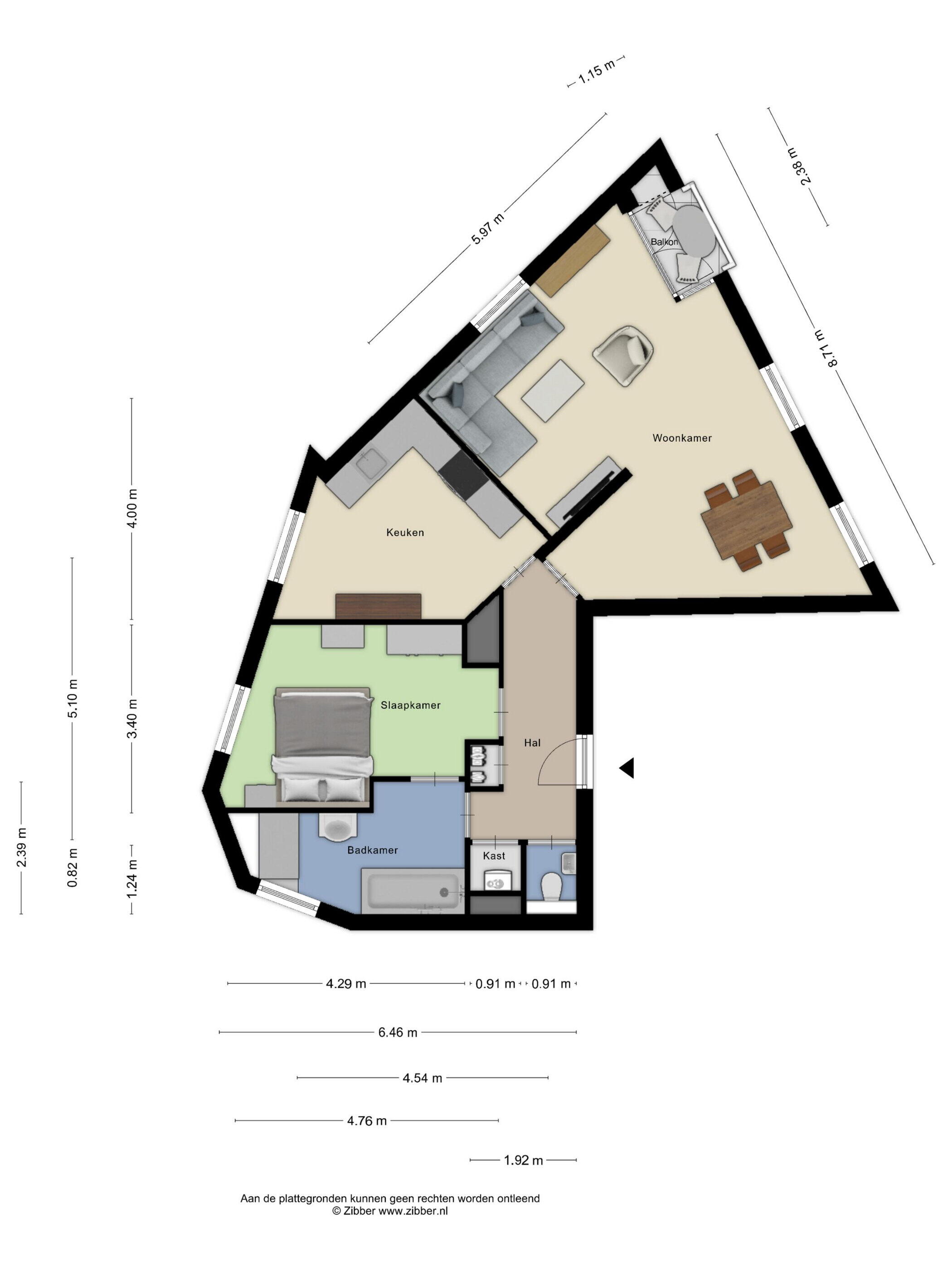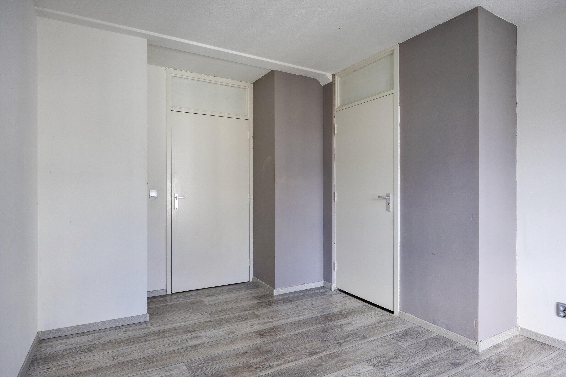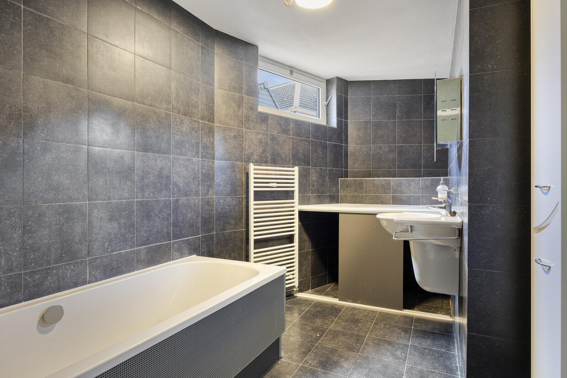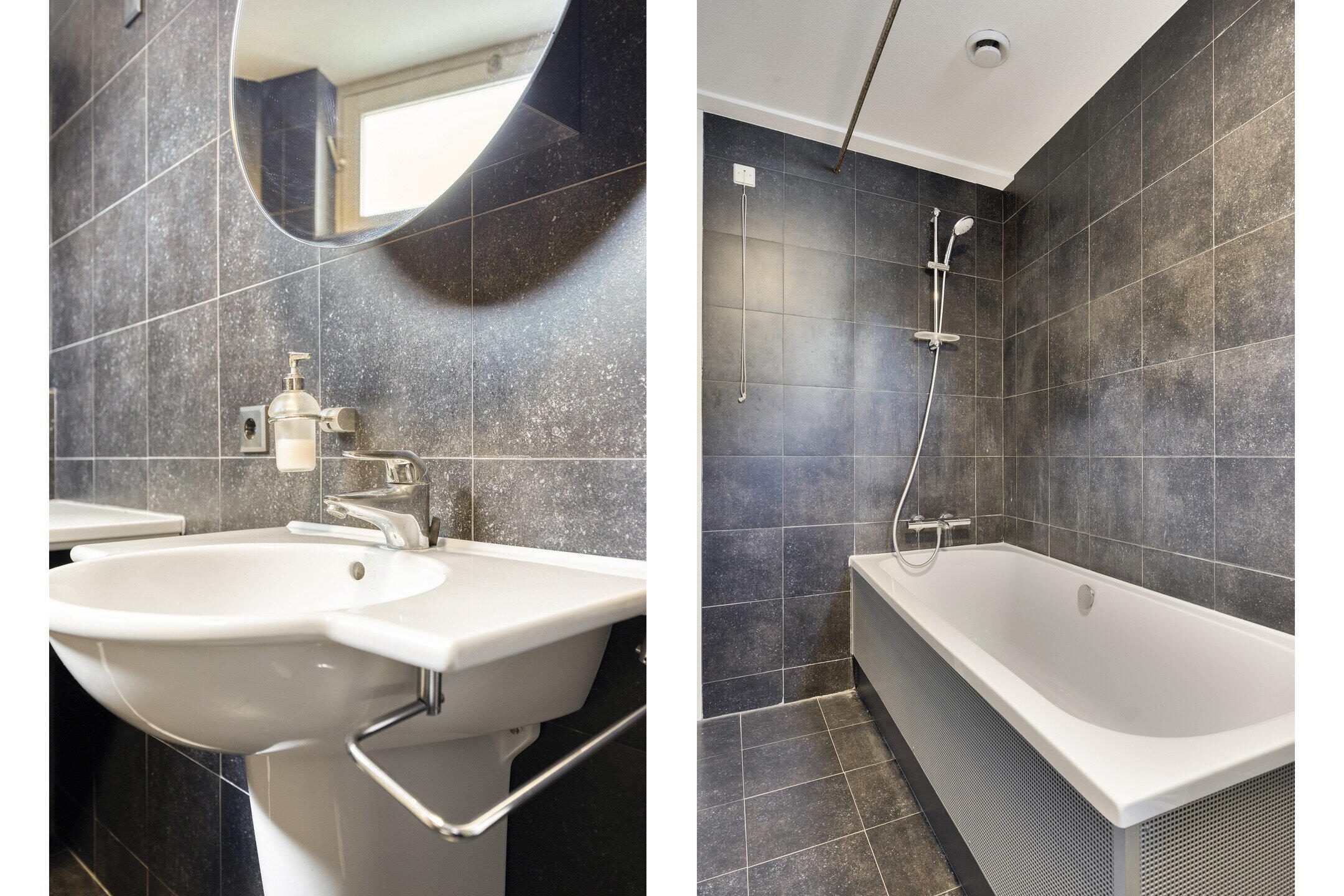 De woning beschikt over één ruime slaapkamer waar je met gemak al je spullen kwijt kunt. De grote ramen zorgen ook hier weer voor een prettige lichtinval. De badkamer is ruim en verzorgd, uitgevoerd met donkere tegels die zorgen voor een moderne uitstraling. Je vindt hier een witte wastafel en een comfortabel ligbad met douchefunctie, ideaal om te ontspannen na een lange dag.